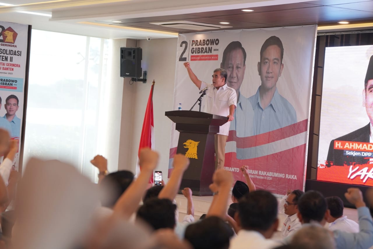 Sekjen Gerindra Ahmad Muzani menghadiri konsolidasi retusan kader dan para caleg Gerindra se daerah pemilihan Banten II meliputi, Kota Serang, Kabupaten Serang, dan Kota Ciledgon di Graha Mahesa, Banten, Rabu (20/12). Dalam sambutannya, Muzani mengatakan, rakyat Banten masih menginginkan Prabowo untuk jadi presiden di pilpres 2024.