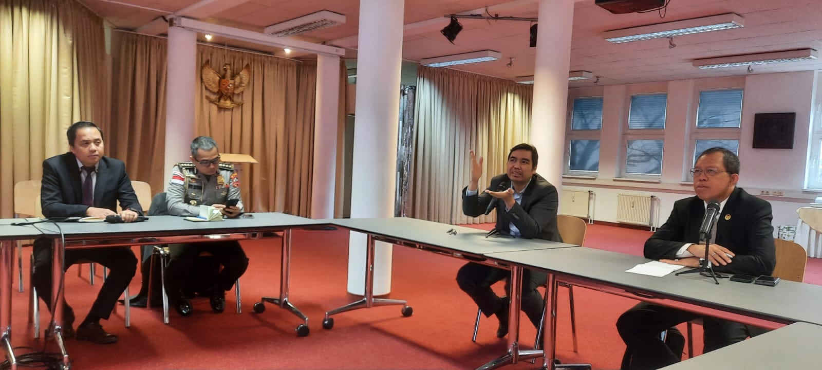 Delegasi Kompolnas yang dipimpin Prof. Dr. Albertus Wahyurudhanto, M.Si, beserta Anggota Delegasi Irjen Pol. (Purn) Drs. Pudji Hartanto Iskandar, M.M., Dr. Yusuf Warsyim, S.Ag., M.H., H. Mohammad Dawam, S.H.I., M.H., dibersamai Brigjen Pol. Musa Ikipson Tampubolon, S.I.K., M.Si, selaku Kepala Sekretariat Kompolnas mengunjungi Kedutaan Besar RI untuk Jerman dalam rangka Pemantauan Pola Pengamanan Pelaksanaan Pemilu Presiden dan DPR RI pada 2024 di wilayah hukum Jerman dan dalam rangka Studi Banding Sistem Kepolisian Jerman.